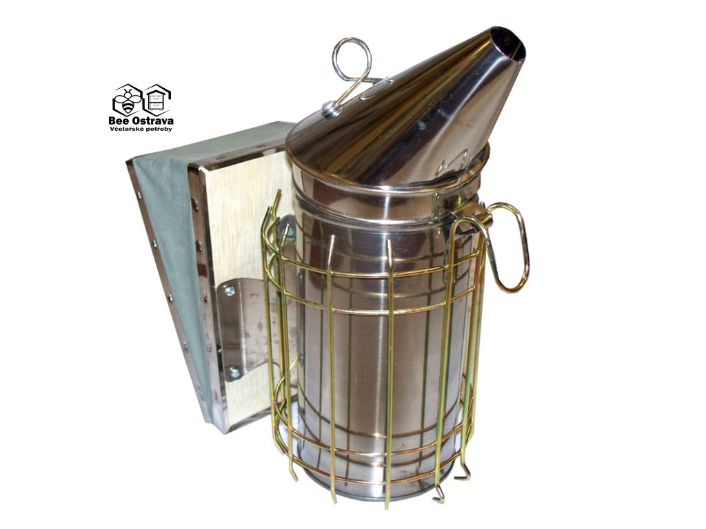 Velký nerezový včelařský kuřák. Rozměry: výška cca 28 cm, vnitřní průměr 10 cm. Měch je velký 13x19 cm.