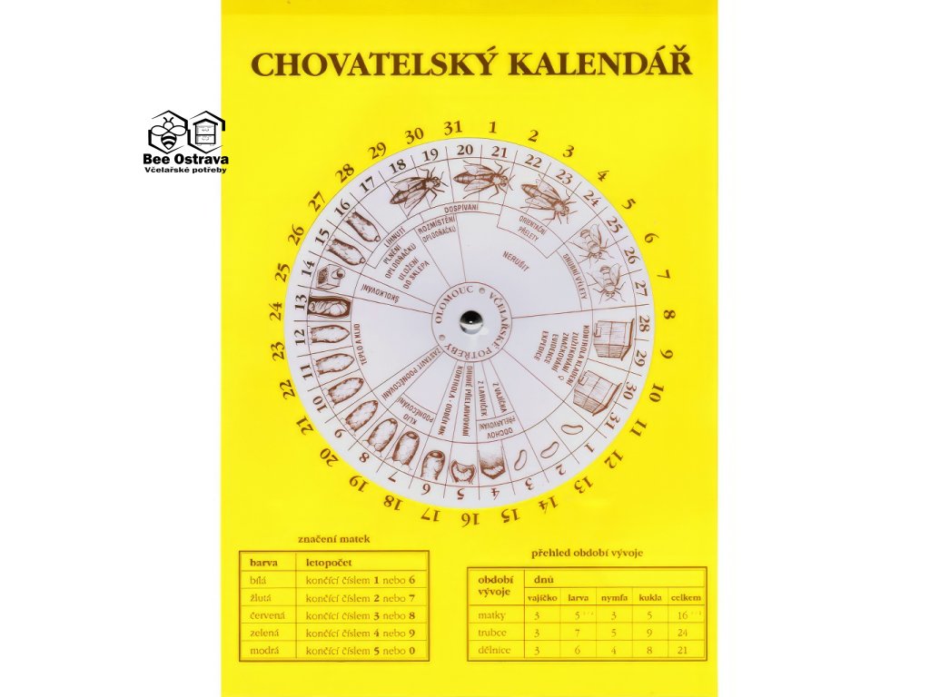 Chovatelský kalendář otáčecí podle data začátku chovu až k rozkladení nové matky. Praktický kalendář který nesmí chybět žádnému chovateli včelích matek. Otočný chovatelský kalendář je výborná pomůcka díky které neztratíte přehled o vývoji včelí matky. Kalendář navíc obsahuje tabulku o značení matek a tabulku s přehledem vývoje trubců a dělnic.