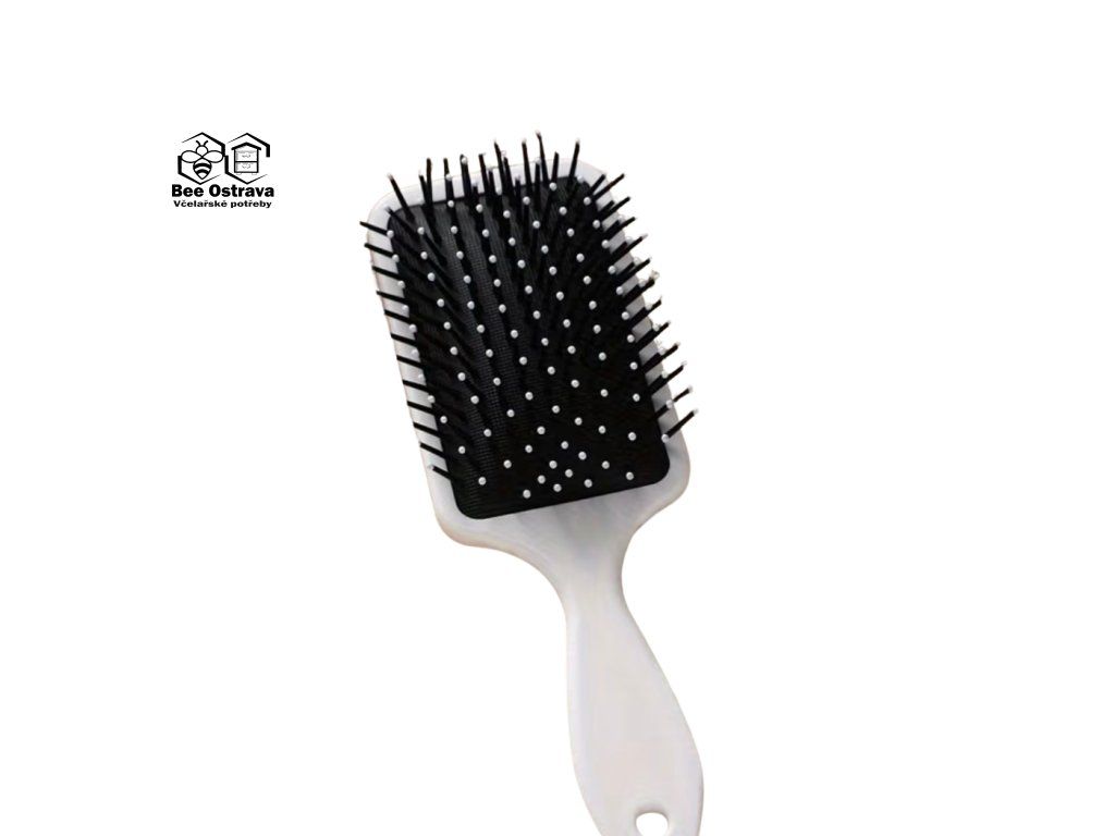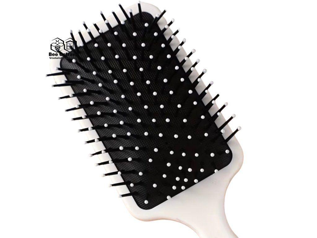 Kartáč na vlasy s motivem včel je praktický doplněk pro každodenní péči o vlasy. Díky nylonovým štětinám s ochrannými kuličkami na konci pomáhá šetrně rozčesávat vlasy bez zbytečného tahání a zároveň jemně masíruje pokožku hlavy.